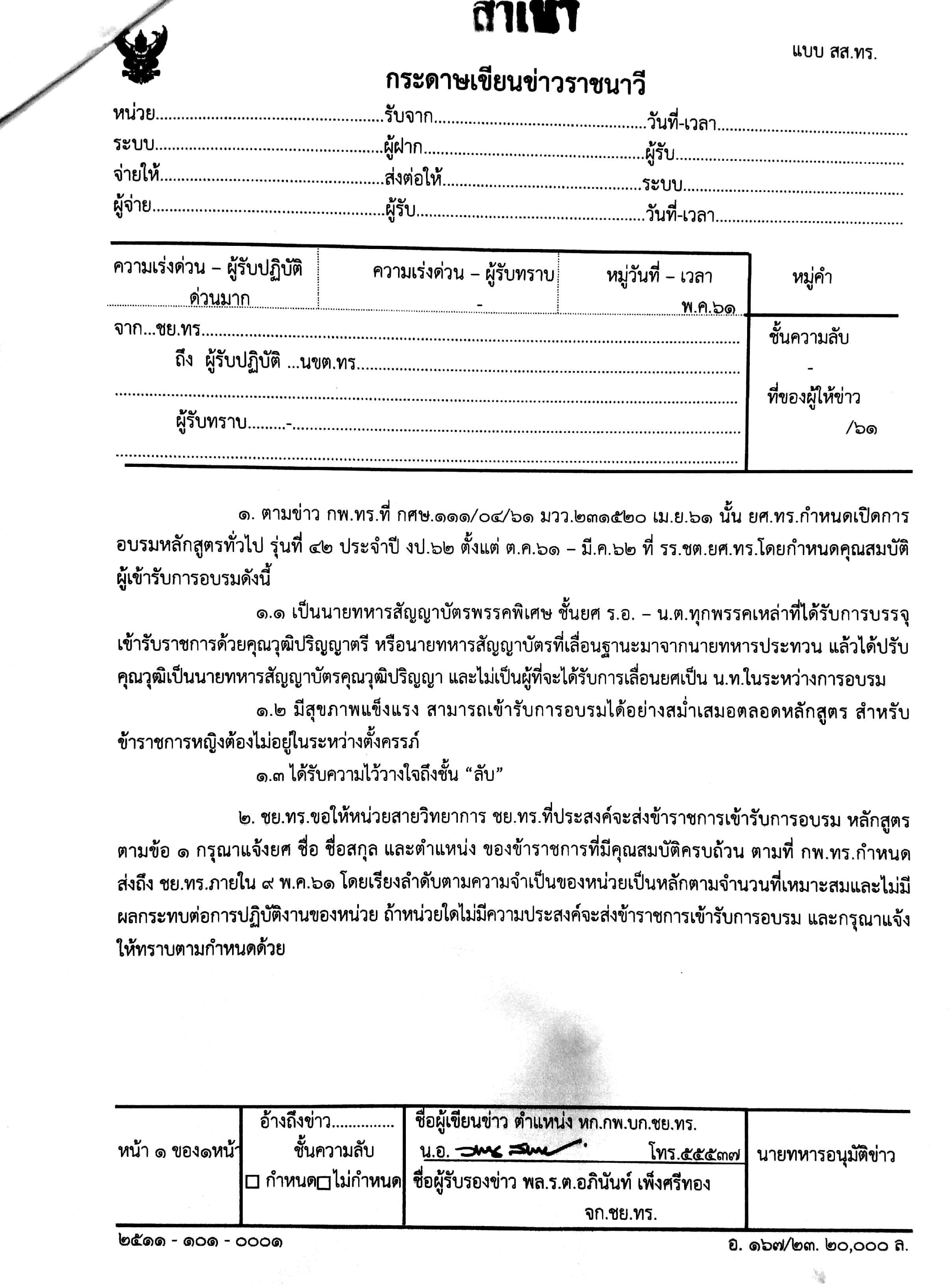 กำหนดให้ นขต.ทร.ส่งรายชื่อผู้ที่จะเข้ารับการอบรมหลักสูตรทั่วไปรุ่นที่ 42 ประจำปีงบประมาณ 6 2ในวันที่ 9 พฤษภาคม 60